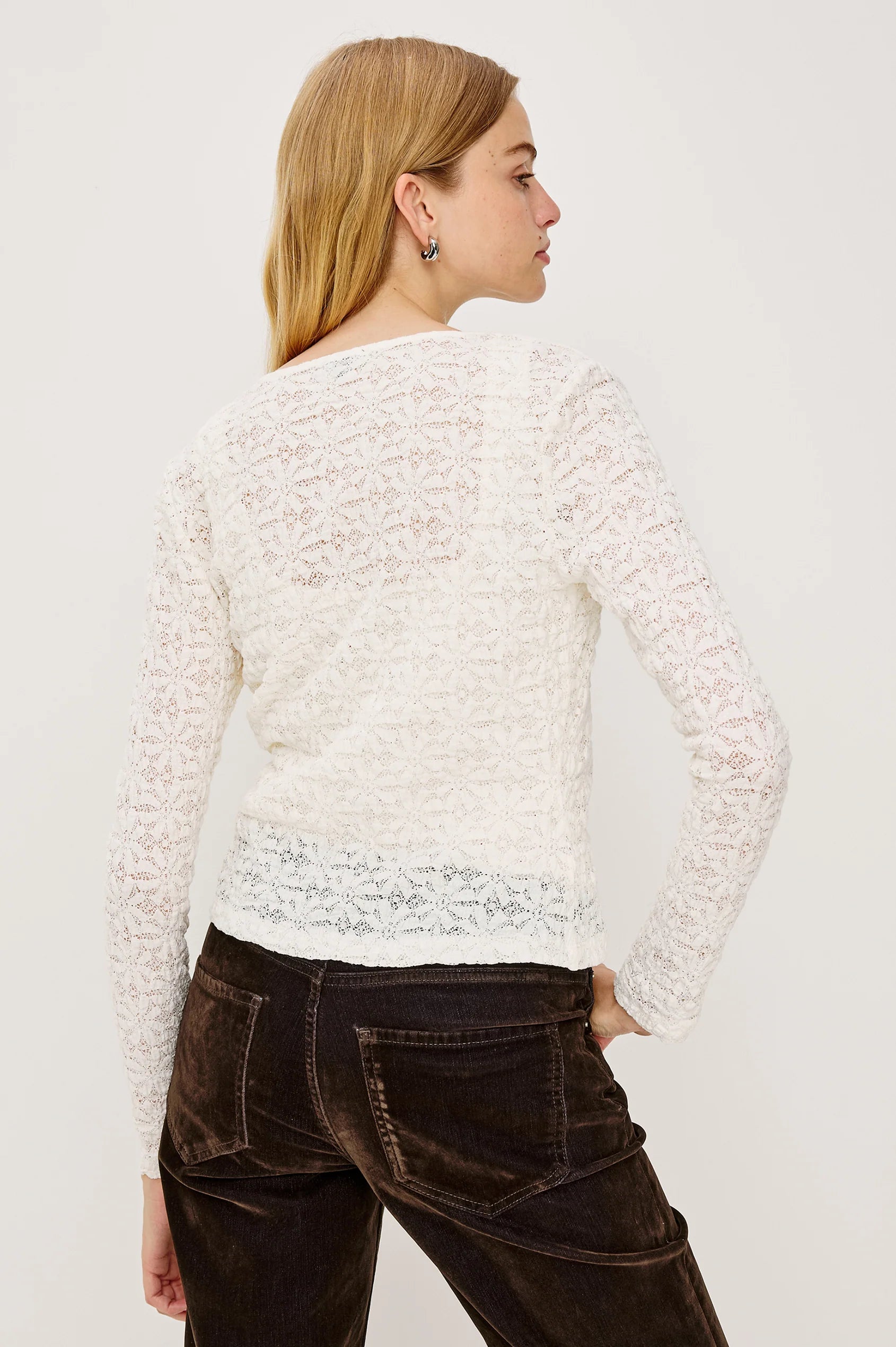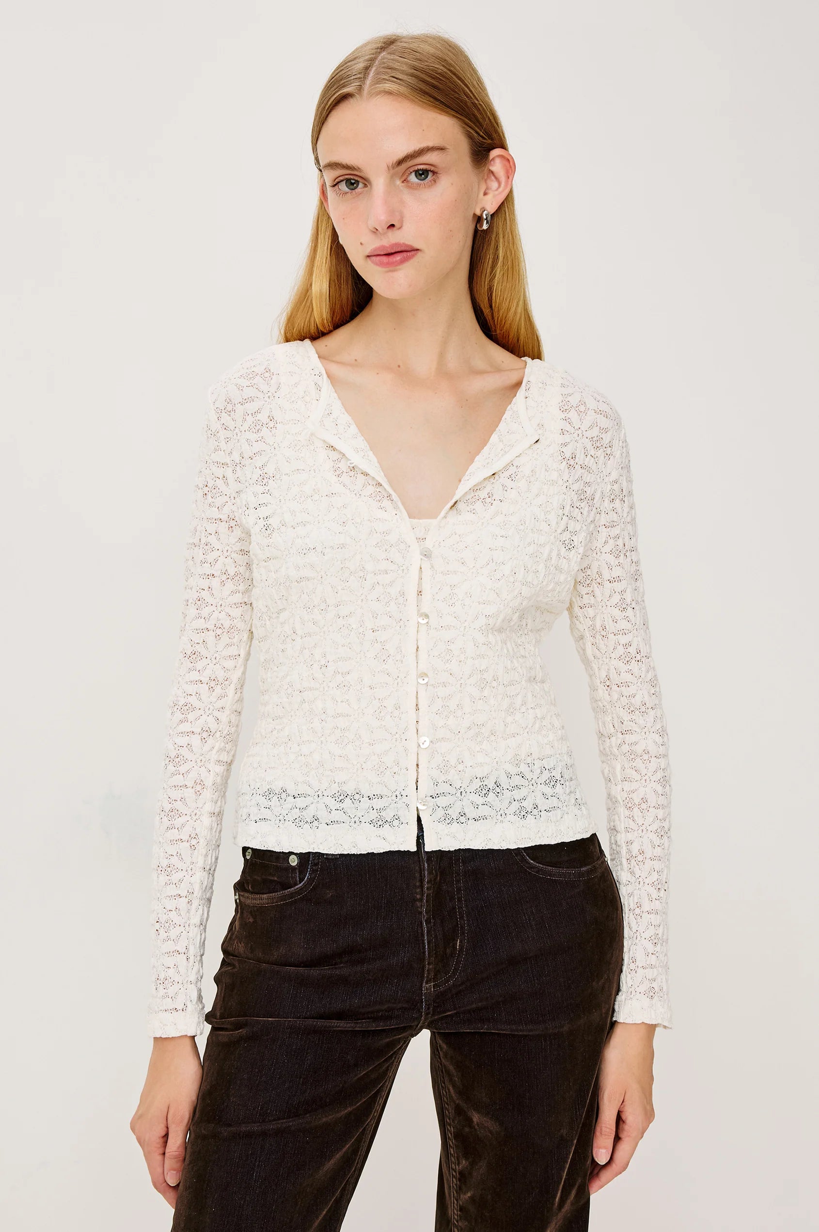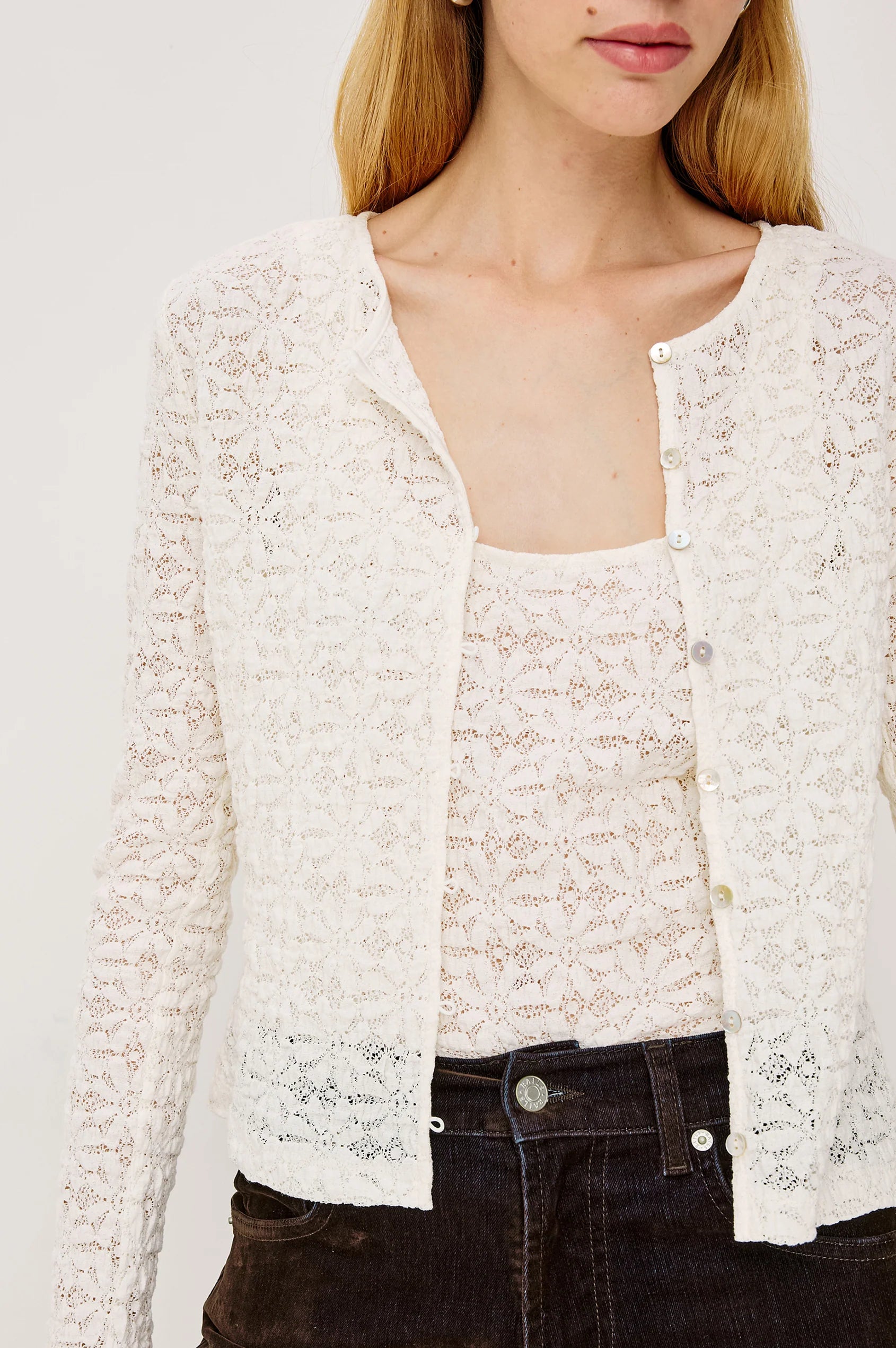 An ideal layering essential, the Cyrah enhances any outfit with sheer, stretchy lace. Detailed with fitted long sleeves and refined front button-and-loop closures adorned with pearlescent accents, it brings elegant texture and polished finishing touches to your wardrobe.