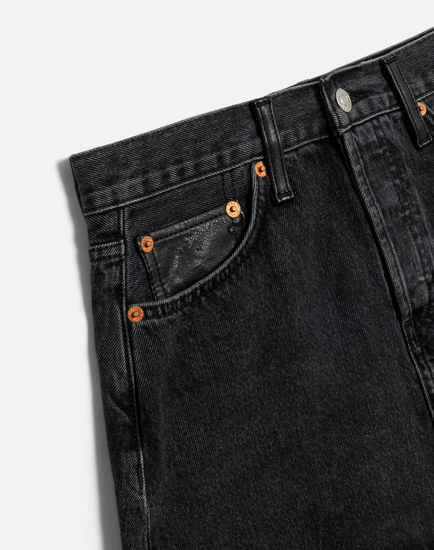 The Aline Classic Skirt is an effortless denim skirt with a bold leather accents for a touch of edge. Features a classic vintage black wash on mid weight rigid fabric, 100% leather accents throughout, classic button fly, and a finished hem.